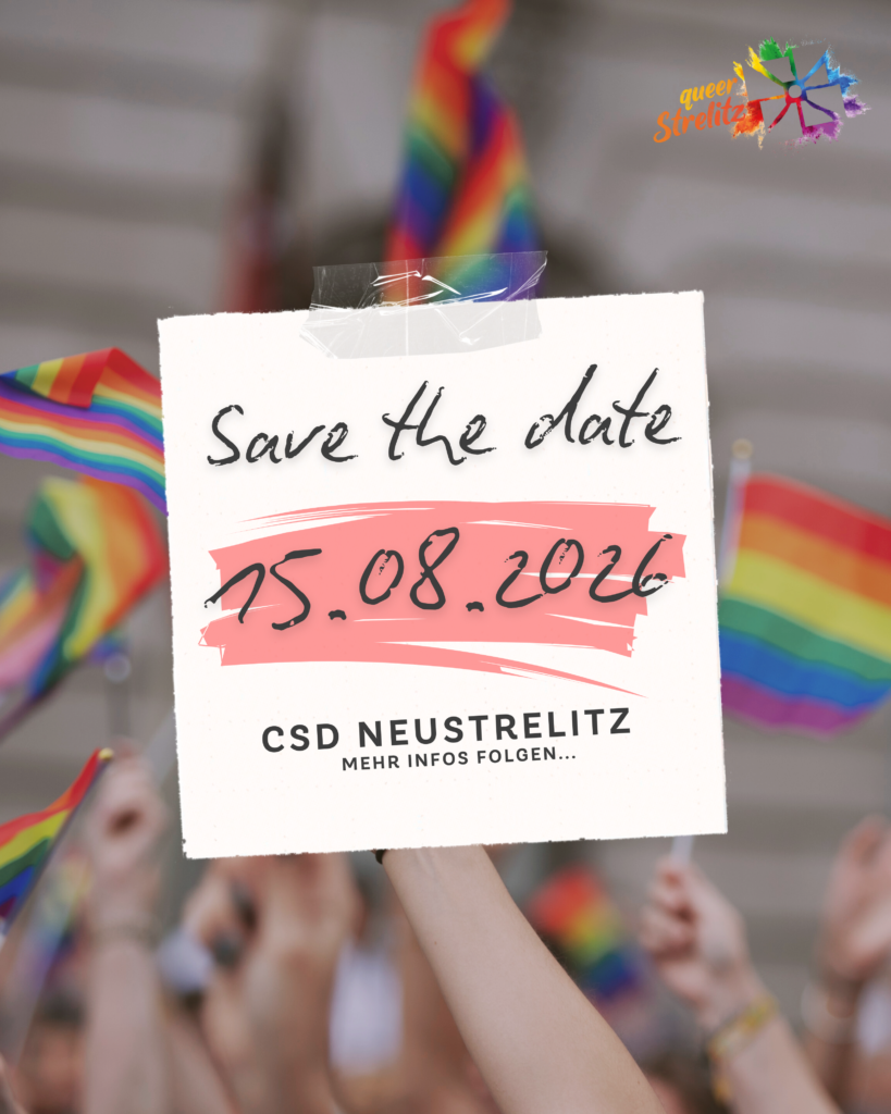 Am 15.08.2026 findet der CSD Neustrelitz statt. Wir suchen dafür noch ein Motto. Wenn dir etwas einfällt, dann schreib uns gerne.